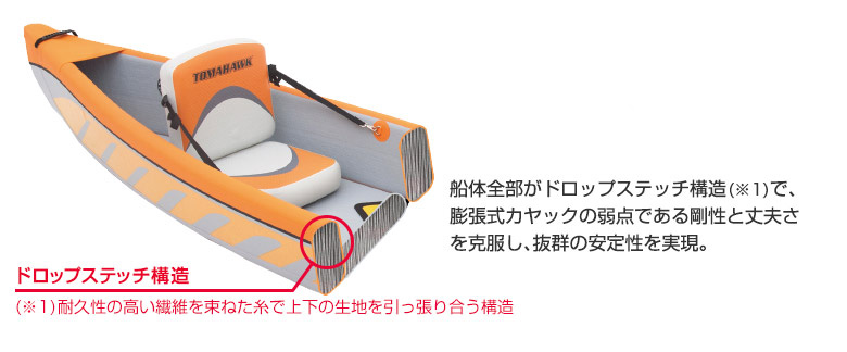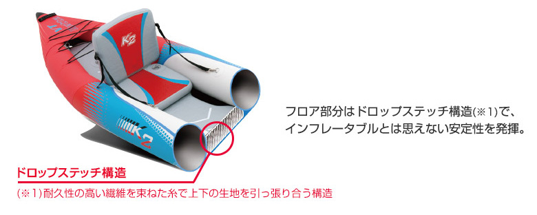 SUPと同じドロップステッチ構造↓という技術を贅沢に船全体に使っており、ハードカヤックに負けない頑丈さと力強さを持っています。