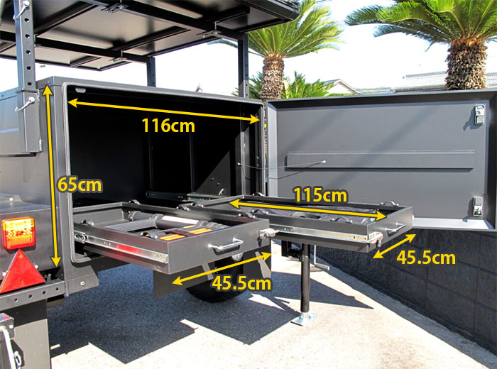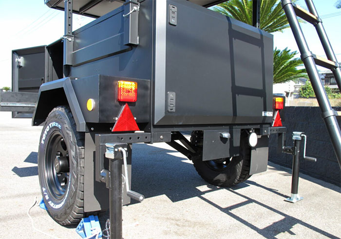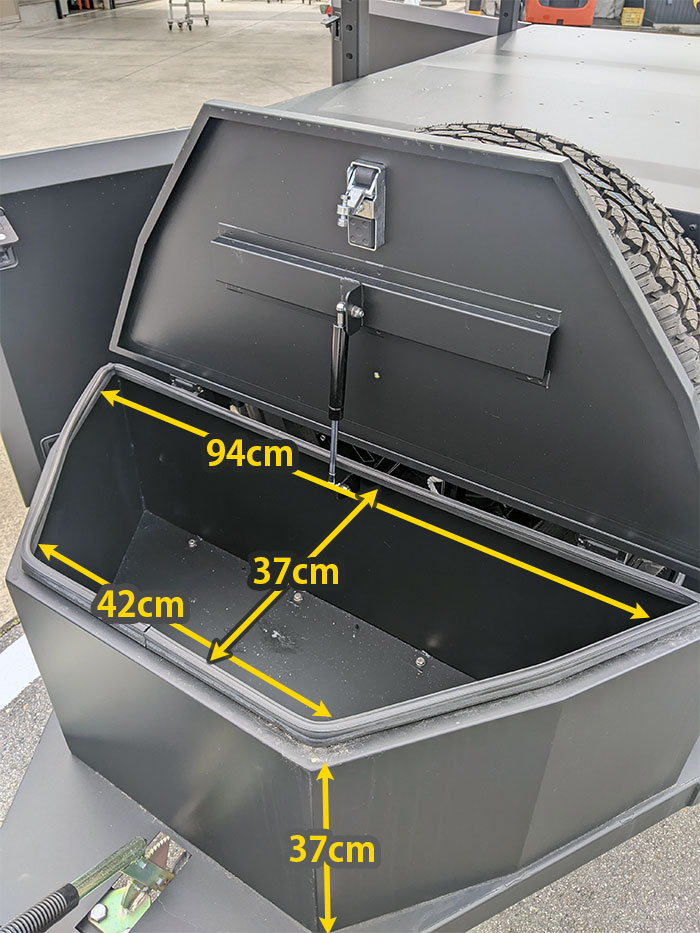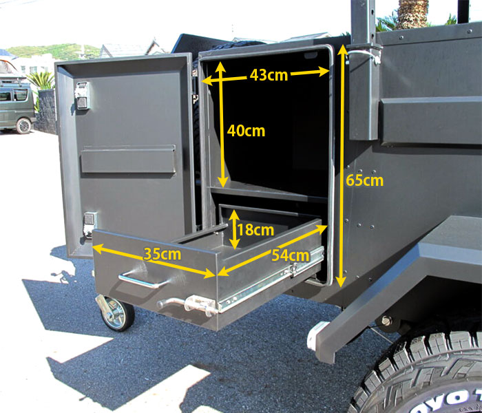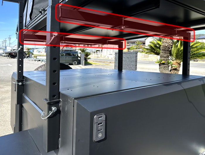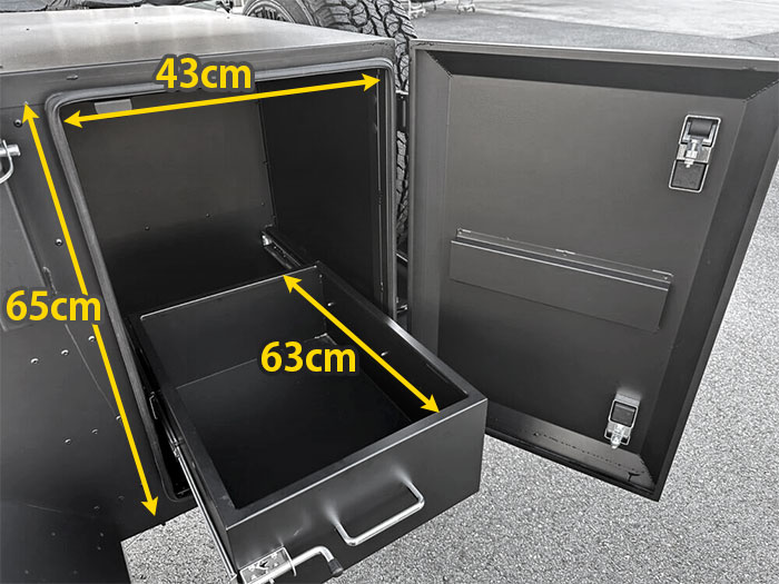 これだけ大きなスペースに荷物を積んで引き出しを目いっぱい出すと、後ろにかなりの荷重がかかってしまいますので、アウトリガーが装備されています。