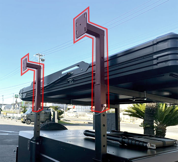 側面から伸びているポールにはルーフテント、カヤック、SUPなどを積載することができます。