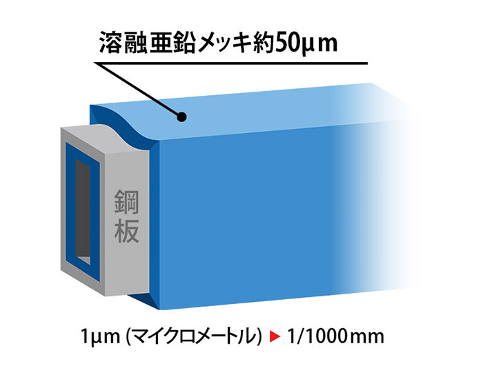 それに対してドブ浸け(溶融亜鉛メッキ)の膜厚は電気亜鉛メッキの約10倍(約50μm)。