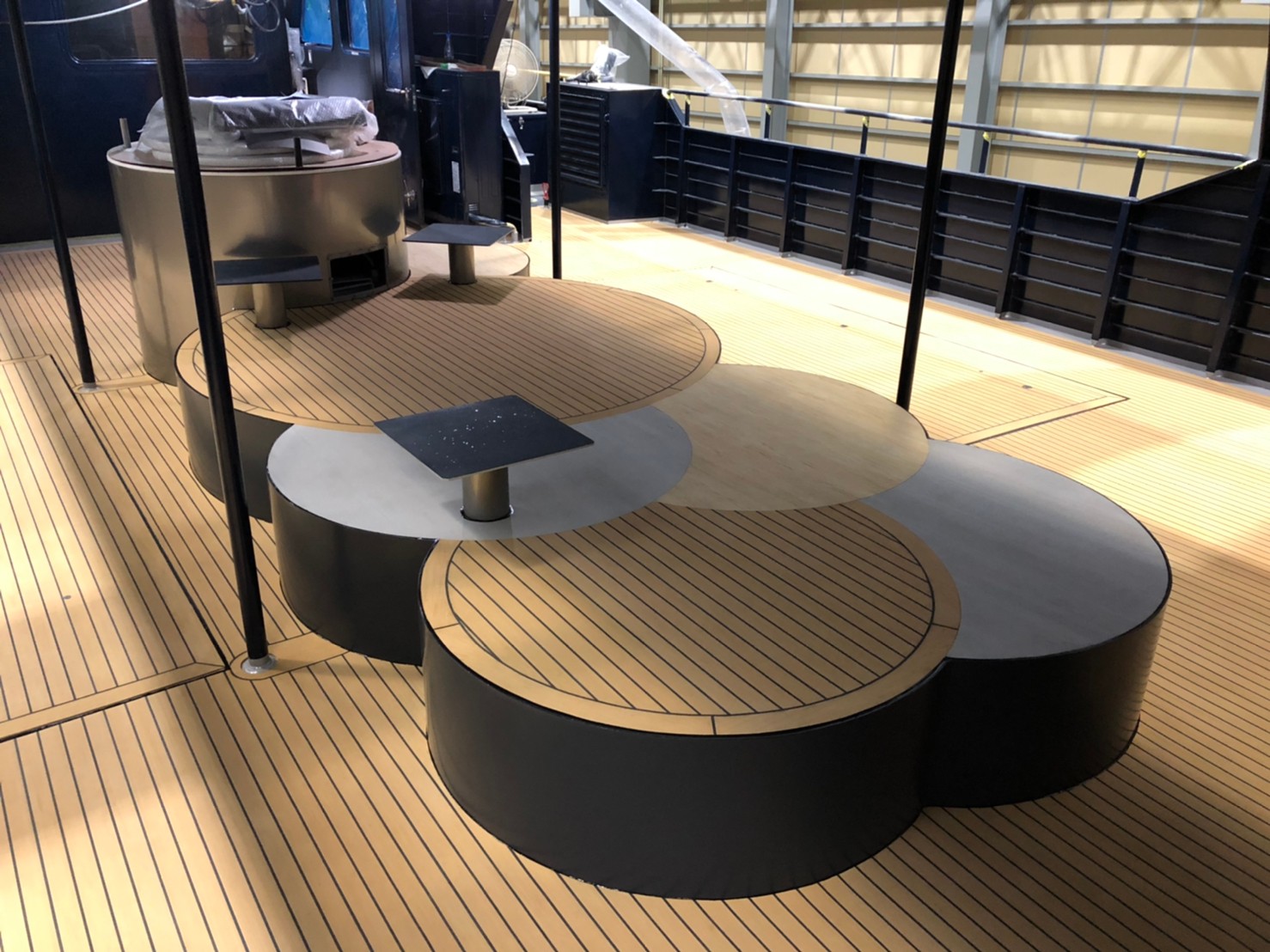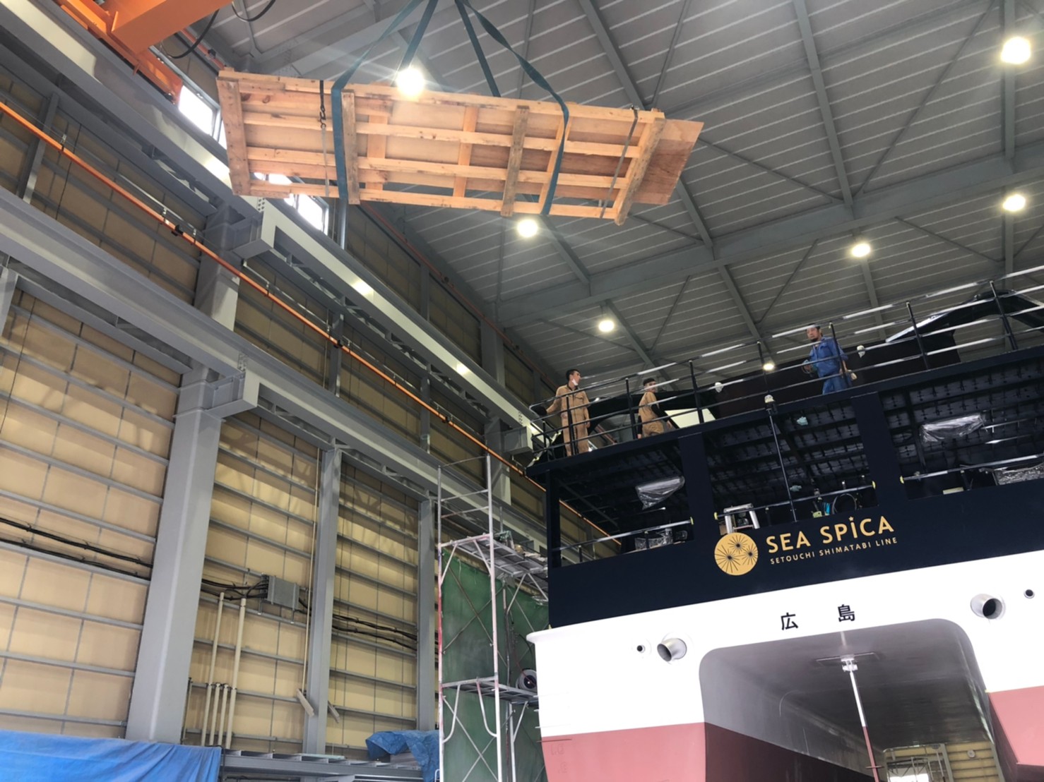 大型船の2階部分での作業となる為、完成したフレキシチークや機材はクレーンで上げていただきました。