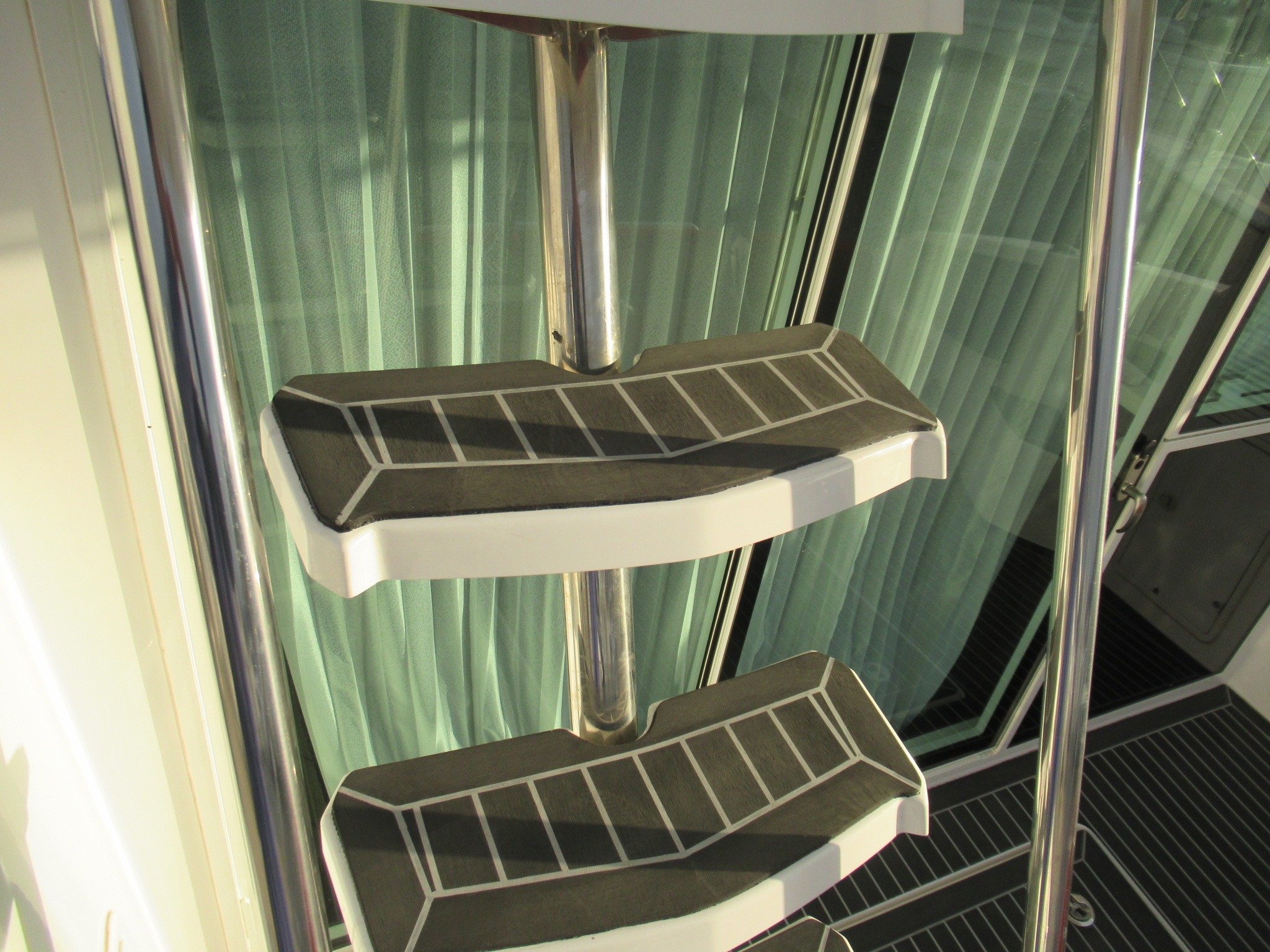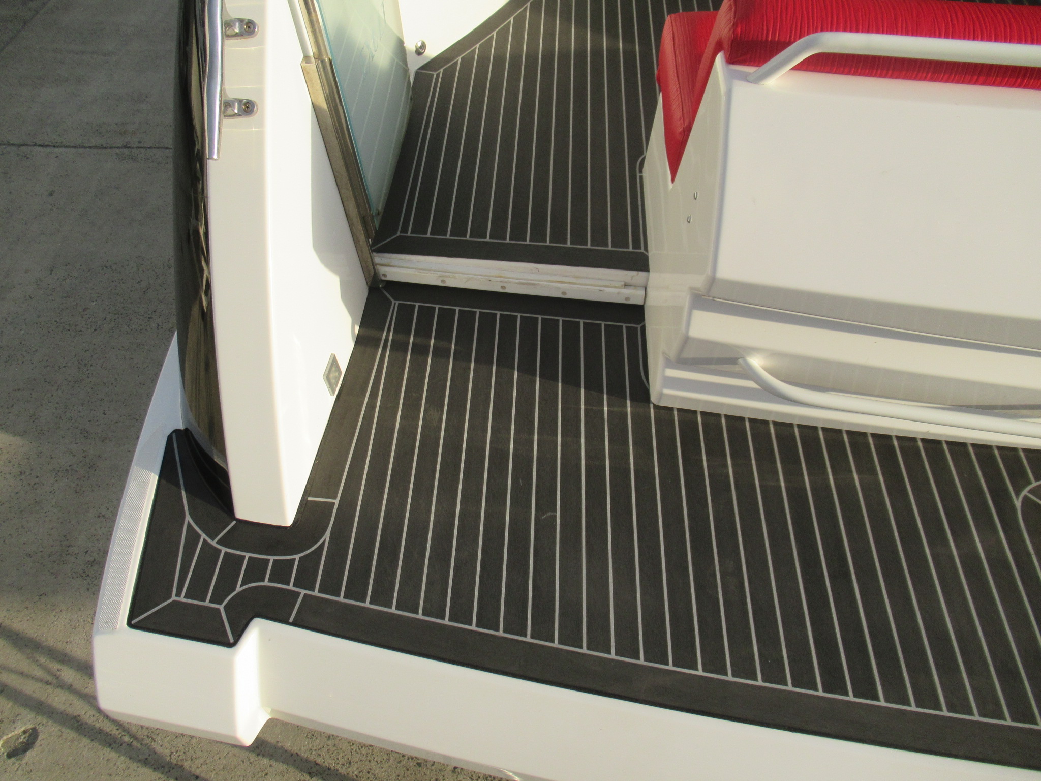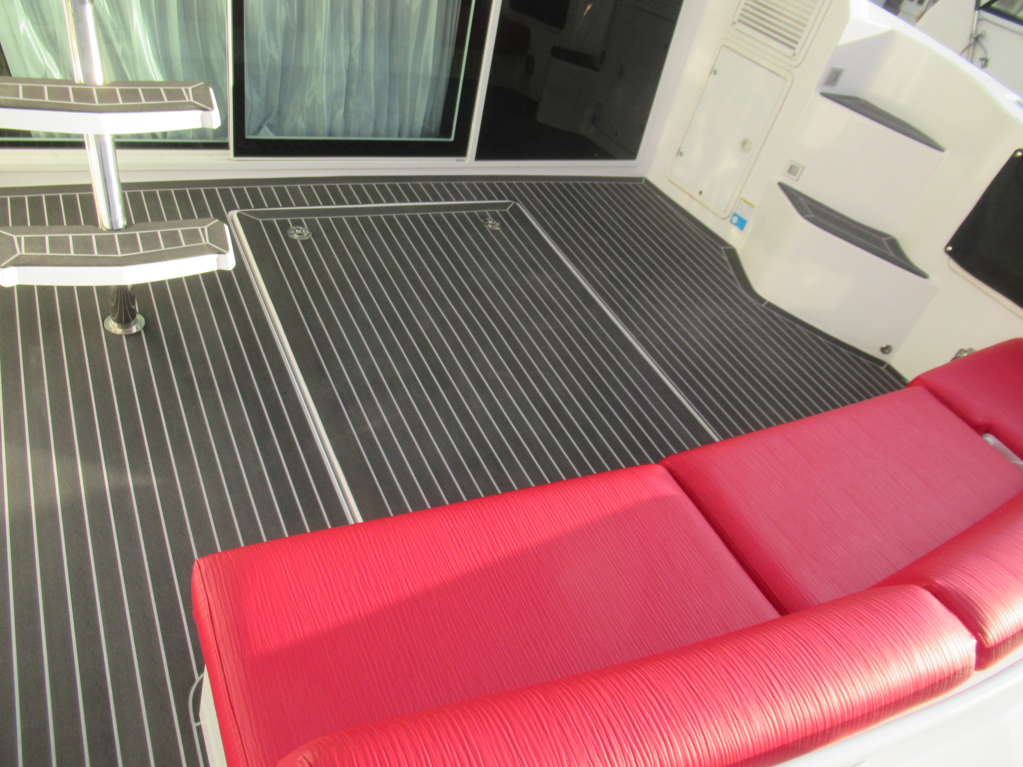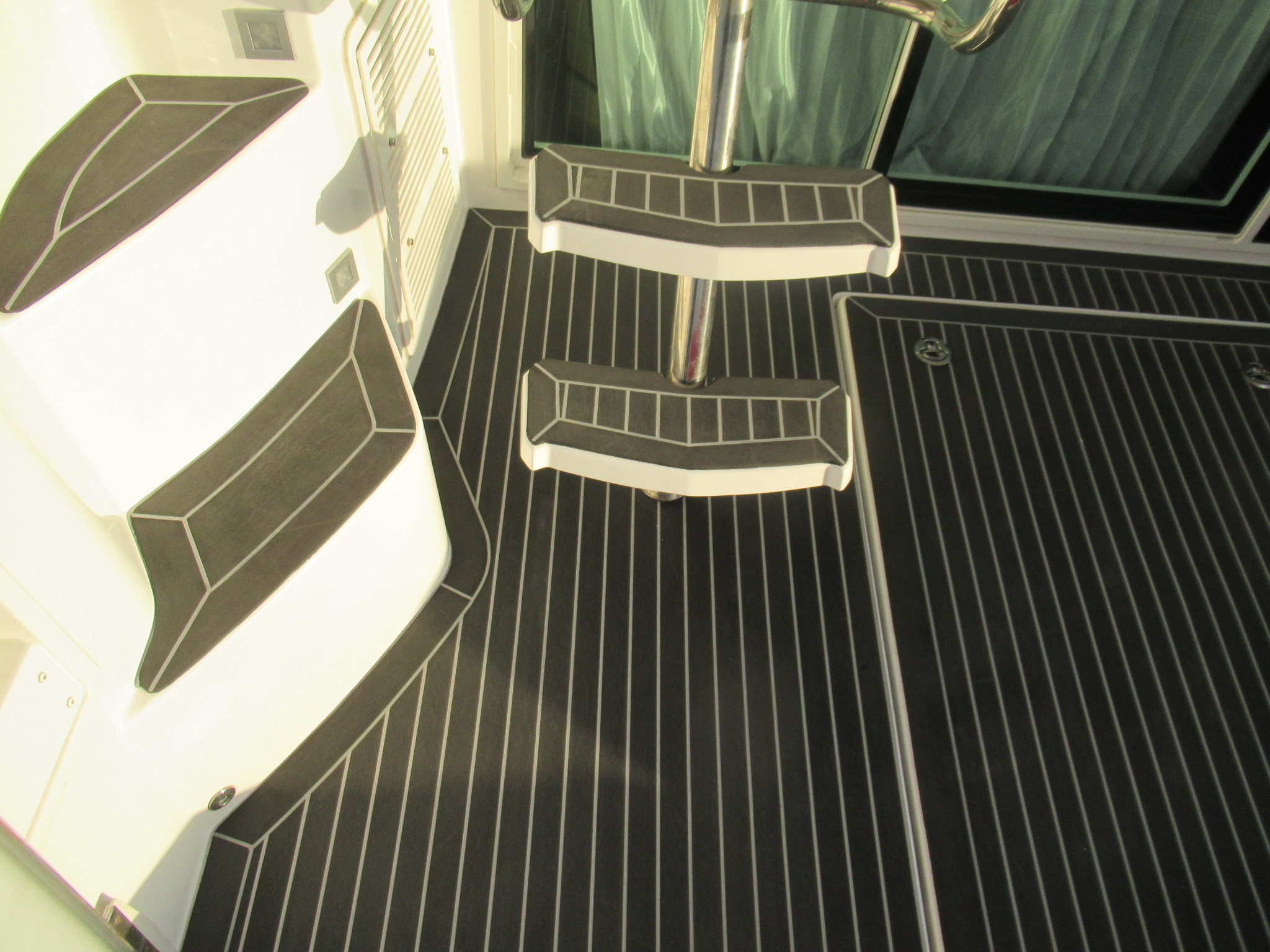 階段とトランサムステップは既存の合成チーク材(他社製品)を剥がしてから施工しております。