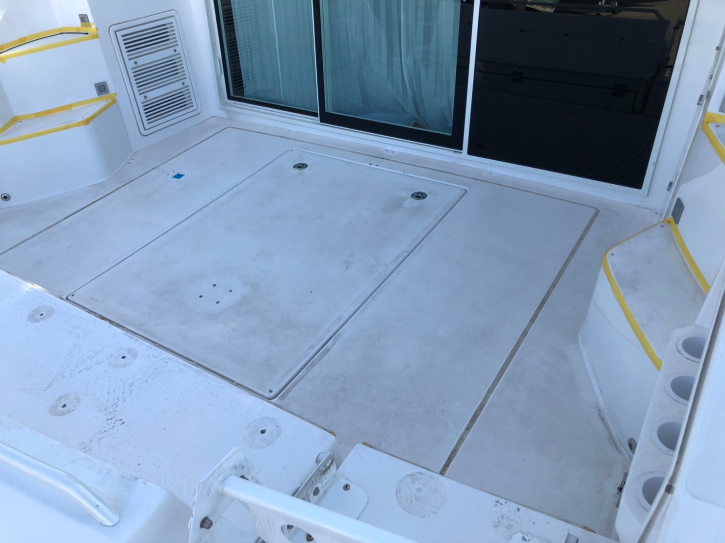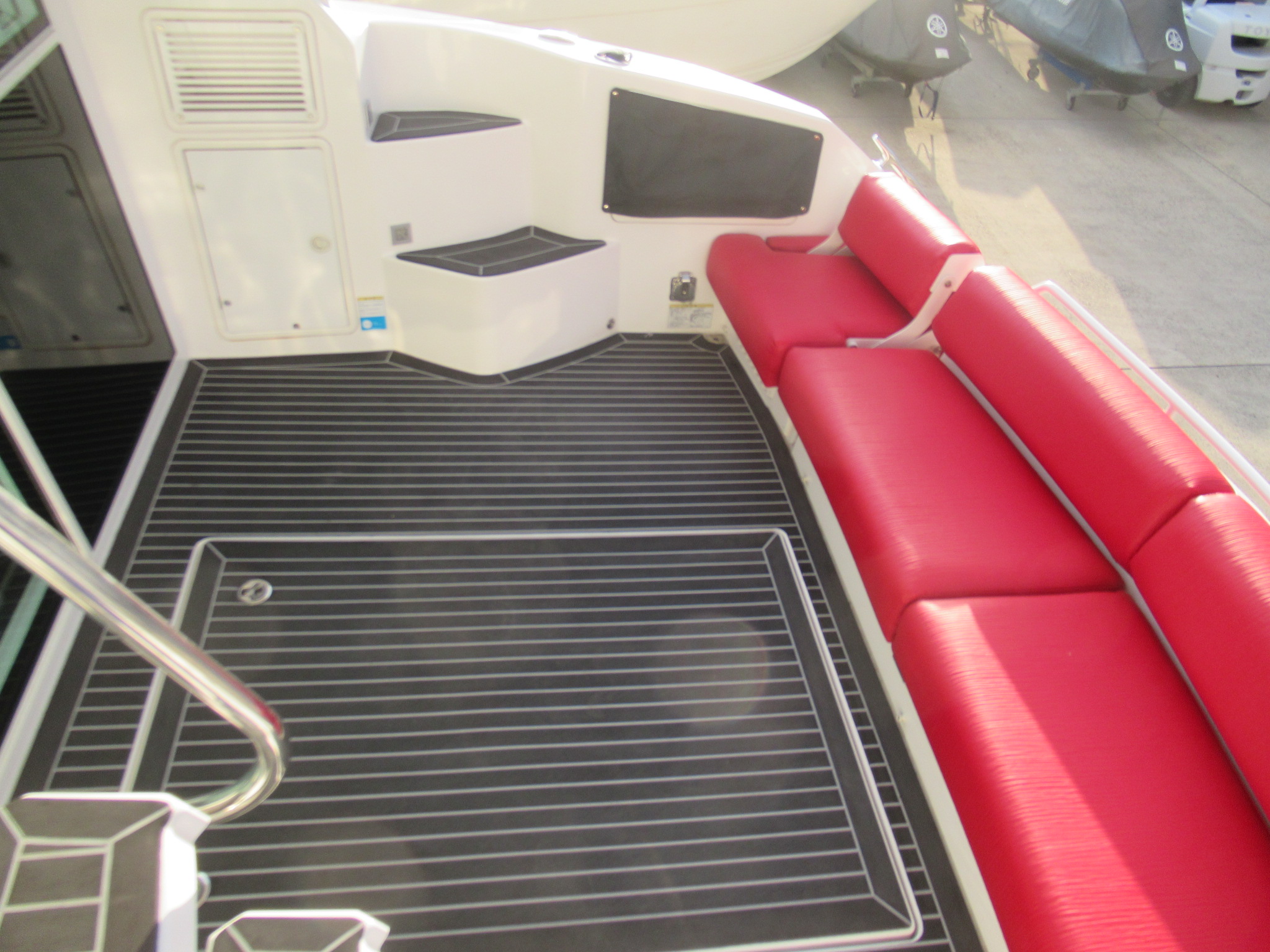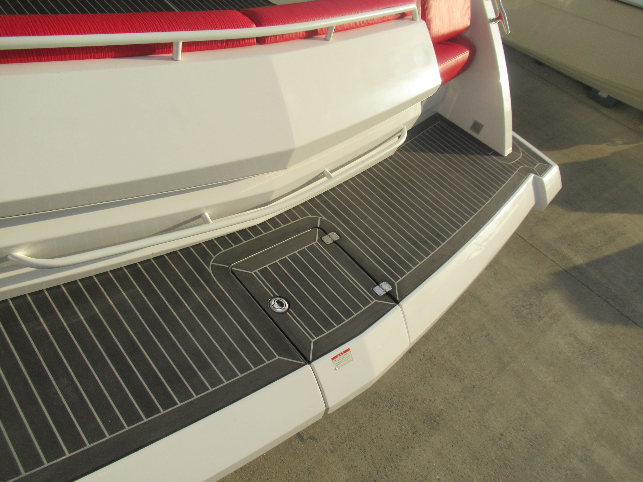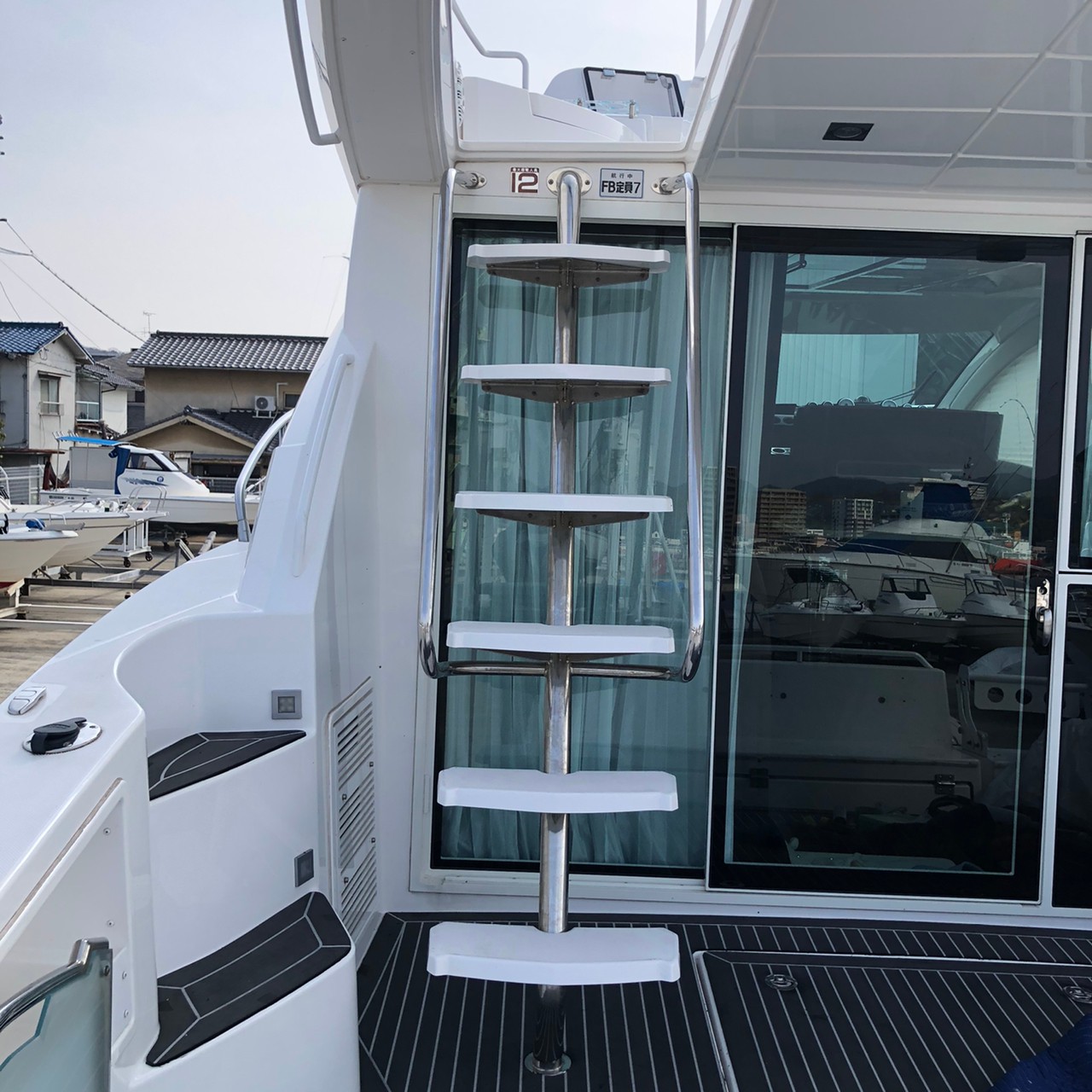 階段とトランサムステップは既存の合成チーク材(他社製品)を剥がしてから施工しております。