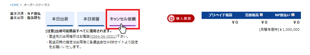 オーダーステータス内のキャンセル依頼より手続きをして頂くことが可能です。(画像参照)