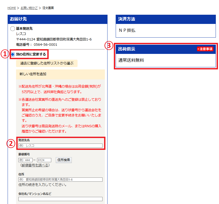 ①注文画面でお届け先を【別の住所に変更する】を選択