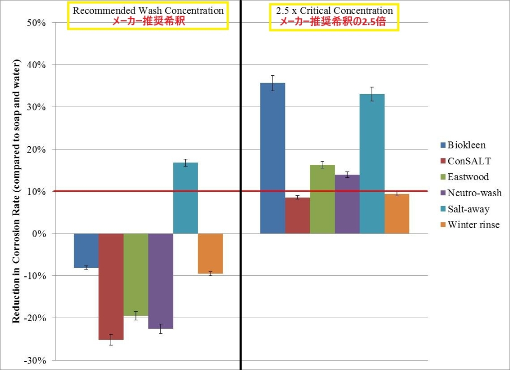 左側のグラフが、各種塩害防止剤(ソルトアウェイのような製品)を、各メーカー推奨の希釈率で洗浄した結果となります。
