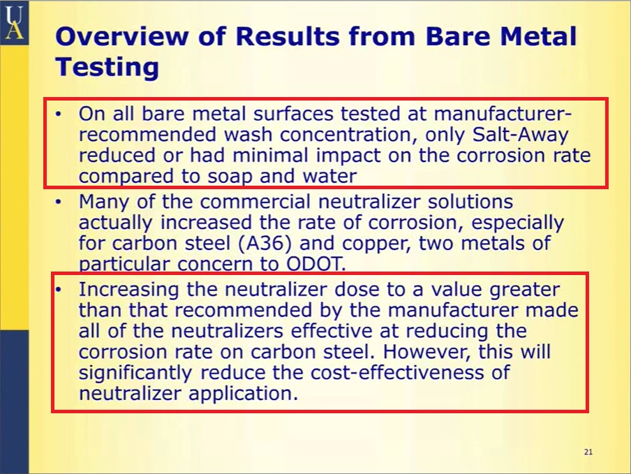 評価結果の中で、ソルトアウェイは腐食抑制の効果とコスト面で高い評価を受けています。