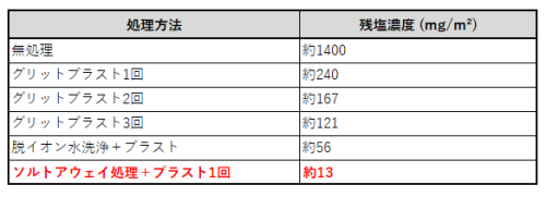 通常のブラスト処理と比較して大幅に塩分を除去できることが分かりました。